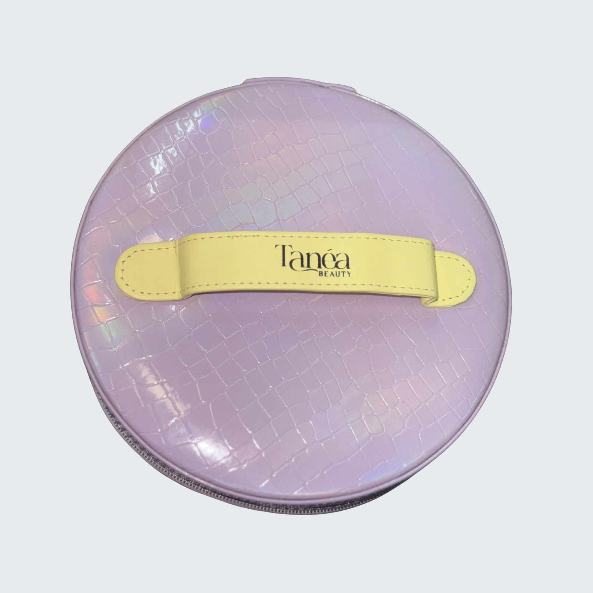 Crafted in a dreamy lilac hue with a subtle holographic croc-texture finish, this vanity box shines beautifully under any light. The soft pastel yellow handle embossed with the Tanéa Beauty logo adds a chic contrast, making it both elegant and eye catching.